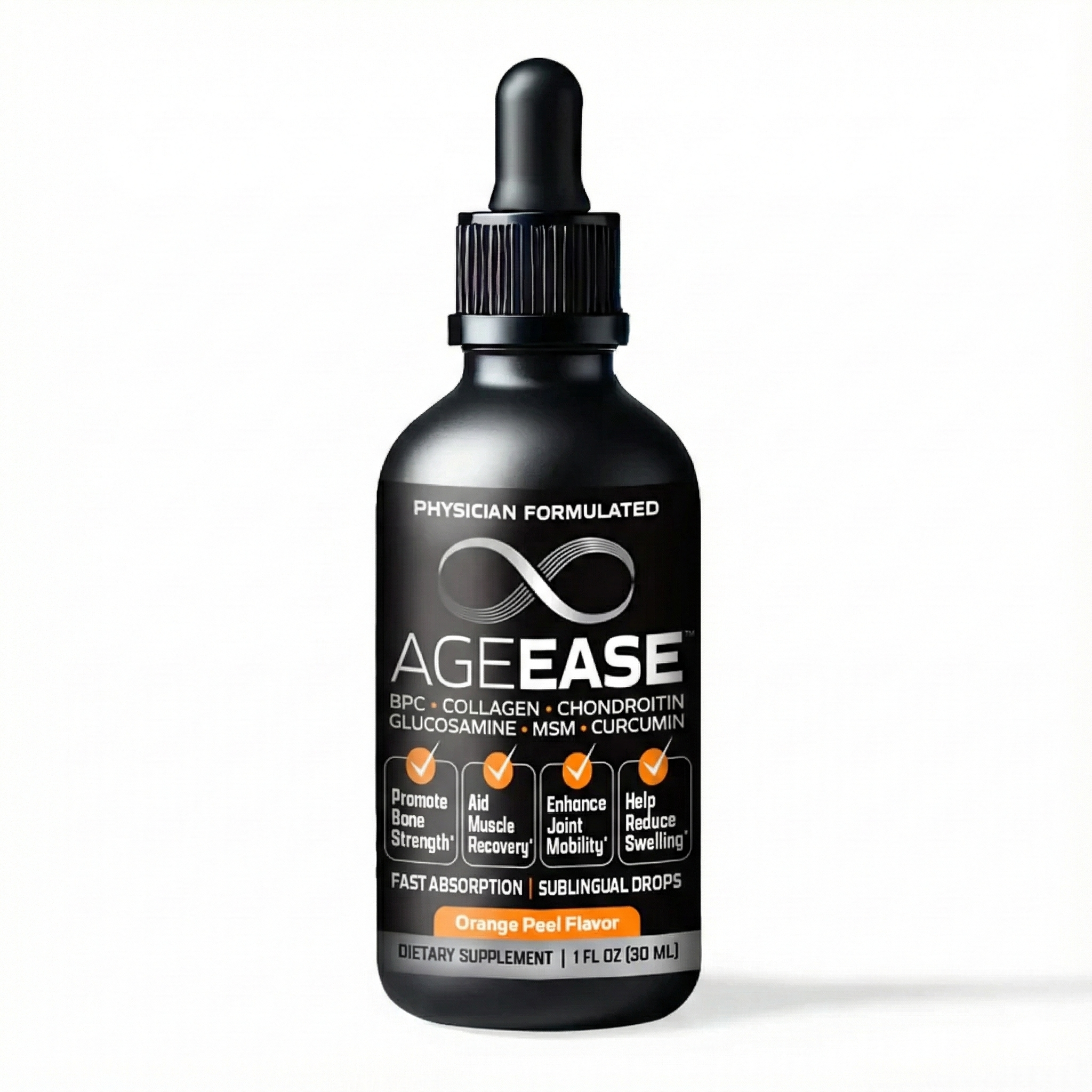 AgeEase Recovery Drops are a physician-formulated, fast-absorbing sublingual liquid designed to support overall joint comfort, mobility, and healthy lifestyle habits. With a carefully selected blend of ingredients, AgeEase helps you maintain an active lifestyle with confidence.